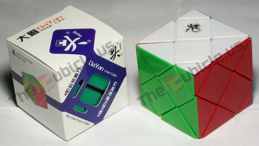 The DaYan Dino Skewb (also called "Four Cube") is a 4-axis cube with different turning mechanisms on the the opposite axes. Half of the axes turn like the master skewb, and the other half turn like the dino cube.