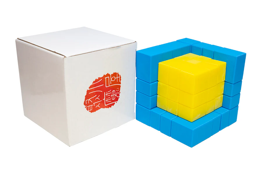 The Grey Matter Mirror Illusion 4x4 is a standard 4x4 with 3D printed extensions attached to the pieces. This gives the puzzle the illusion of looking like a yellow 3x3 sitting on a blue pedestal.