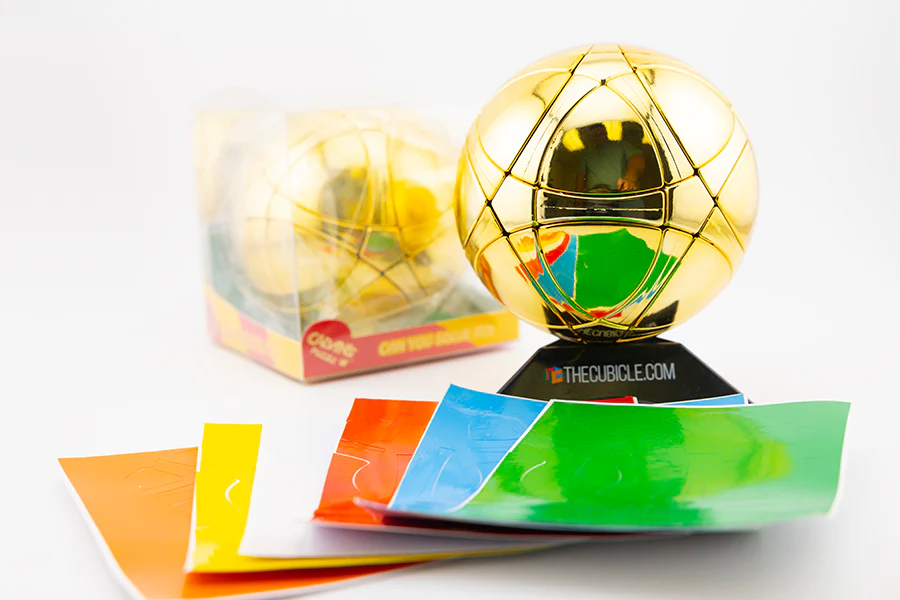 The Traiphum Megaminx Ball is a megaminx puzzle that has been rounded until it resembles a perfect sphere. This version is metallic gold and comes with a set of 6 different color stickers.