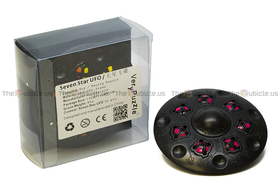 The VeryPuzzle Seven Star UFO is a 2-layered disk-shaped puzzle with 7 independently-turning ball-shaped 2x2s embedded around the center. Each of the 7 2x2s can be turned by themselves, and the entire disk can be rotated to shift the 2x2 parts around the disk. The puzzle is packaged inside a plastic display case.